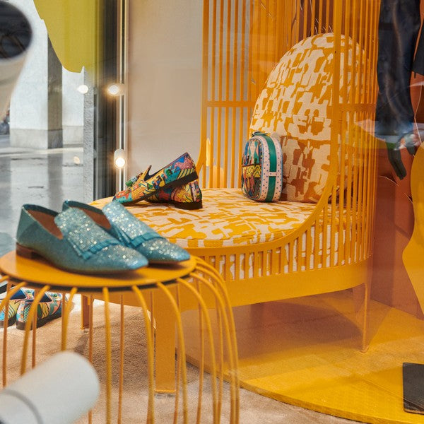 Gli artisti firmeranno le vetrine della boutique milanese di via Montenapoleone, che si colorano di un giallo e verde sgargiante, ricreando così un’atmosfera fresca, dai tratti esotici. Questo è solo il primo passo di una partnership che prenderà poi vita nel 2024, con la realizzazione di un sabot frutto della contaminazione tra la cultura occidentale e quella orientale.