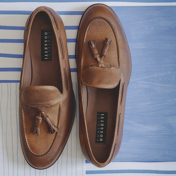 Milano Moda Uomo, giugno 2023 - Fratelli Rossetti ancora una volta reinventa i codici dell’eleganza maschile, proponendo un nuovo formale caratterizzato da linee morbide e destrutturate: modelli dalla punta arrotondata e una suola in cuoio dipinta a mano , così come il pellame reso unico da materici effetti di chiaro-scuro, grazie alla tamponatura dei nostri maestri artigiani.