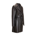 Raffinato cappotto dalla vestibilità relaxed, realizzato in morbida nappa nera. Il modello si distingue per lallacciatura con bottoni, le tasche applicate e la pratica cintura coordinata che valorizza la silhouette. Il collo a revers e la spalla scesa completano il design, conferendo al capo unallure contemporanea e disinvolta.