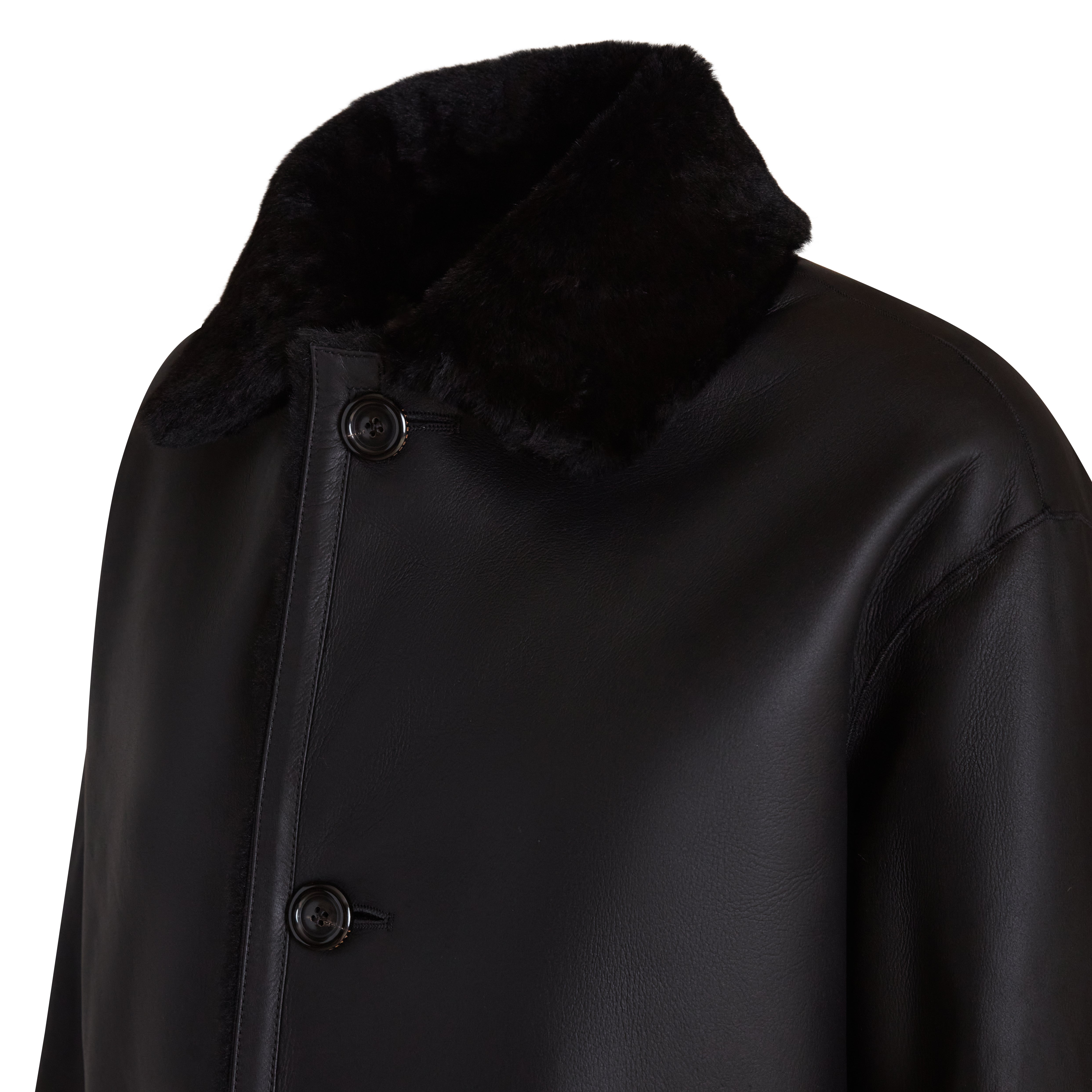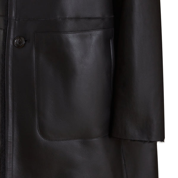 Cappotto reversibile realizzato in morbido shearling nero con leggera nappatura. Capo reversibile, femminile ed avvolgente. La chiusura con bottoni in corno naturale e il collo a camicia completano il look minimal e sartoriale.
