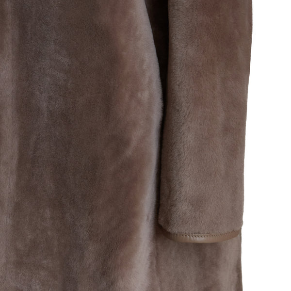 Raffinato cappotto reversibile realizzato in morbido shearling nappato in caldo color tortora. Caratterizzato da un ampio cappuccio rimovibile, le maniche lunghe sono rifinite a taglio vivo e facilmente risvoltabili. Design essenziale con chiusura centrale con zip metallica. Il capo ha una vestibilità regolare.