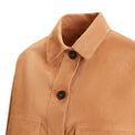 Giacca realizzata in morbida pelle scamosciata color sabbia, dal look casual e ricercato. Presenta collo a camicia e chiusura frontale con bottoni in corno naturale e logo laserato, per uno stile essenziale e versatile. Le tasche applicate con patta aggiungono praticità e un tocco contemporaneo, mentre la vestibilità leggermente boxy assicura comfort e libertà di movimento. Perfetta per completare con stile gli outfit di stagione.