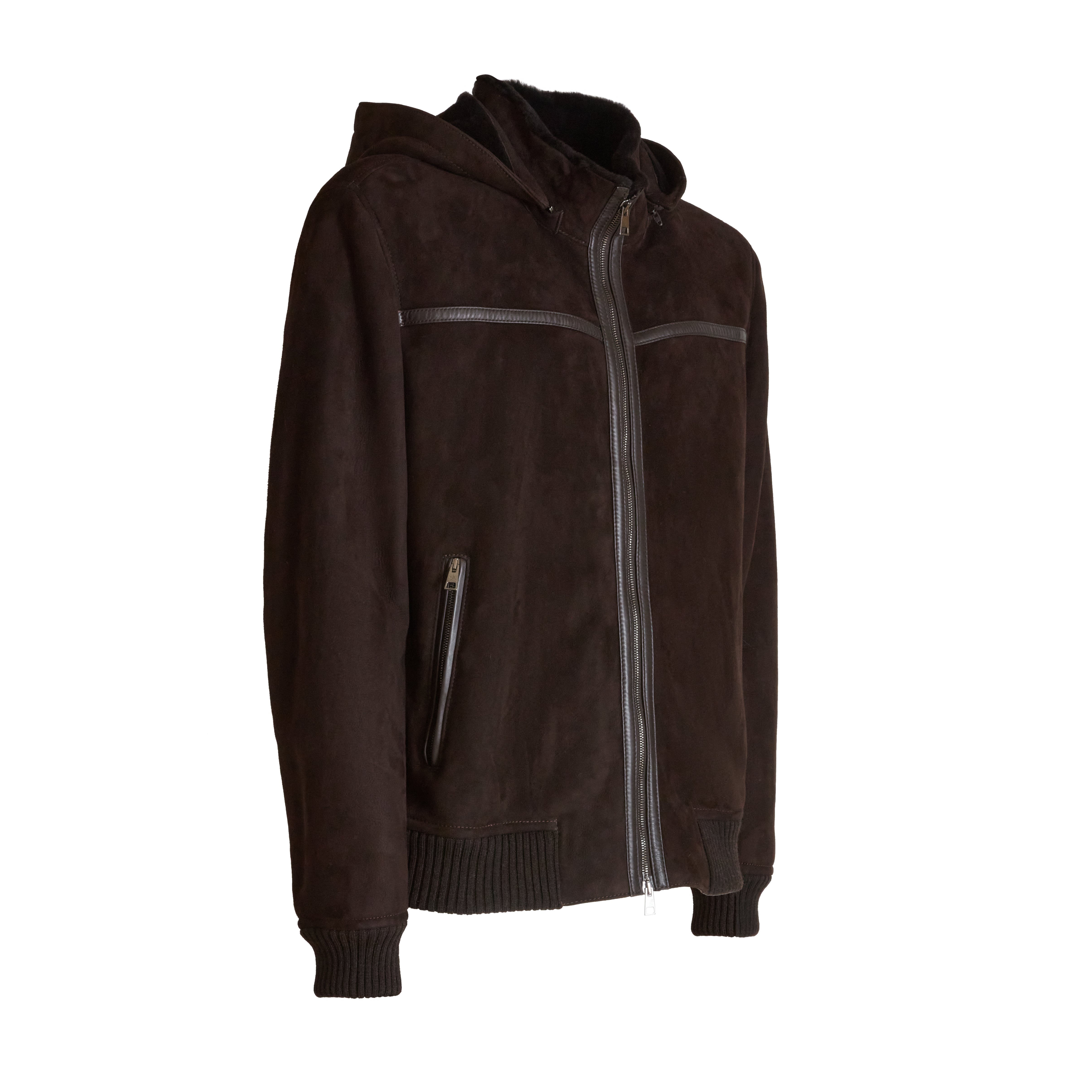 Raffinato bomber in shearling verde muschio con finitura scamosciata. Questo capo si caratterizza per i profili in pelle che spezzano l'estetica lineare del capo, creando movimento. Il cappuccio è rimovibile e il fondo e i polsi sono in maglia di lana a coste in tono.
