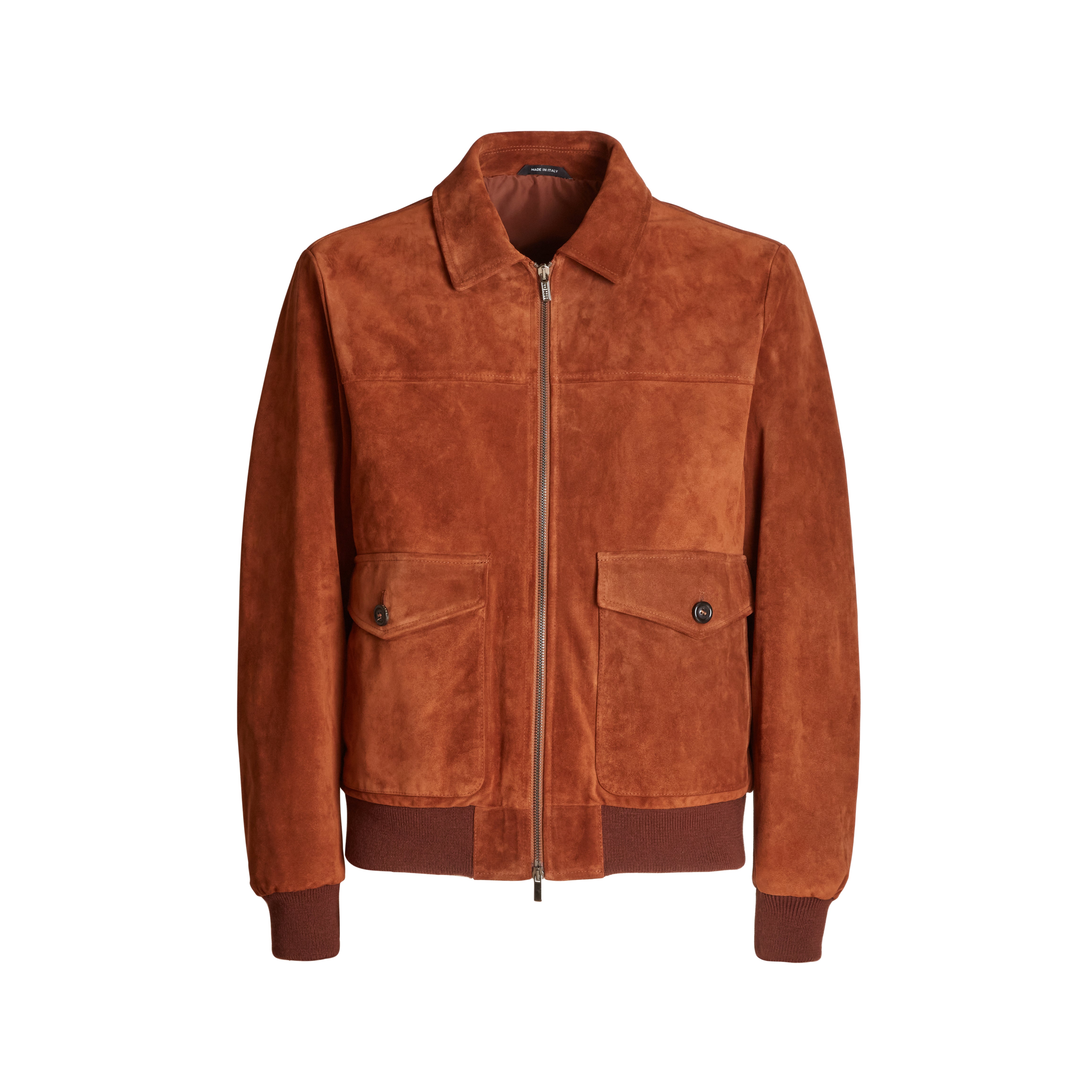 Giubbino bomber realizzato in morbida pelle scamosciata nell'intramontabile color cuoio. Capo caratterizzato da chiusura frontale con zip, colletto a revers, polsi e fondo provvisti di fascia in maglia elastica a coste in tono. Tasche applicate con bottoni in corno naturale. Modello evergreen per un look raffinato e rilassato.