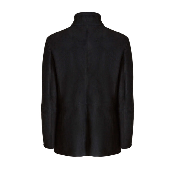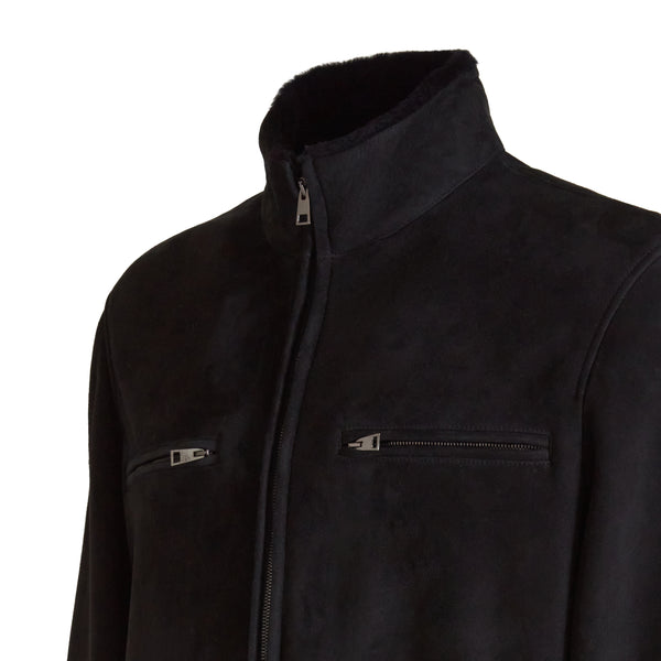 Giacca in raffinato shearling con effetto scamosciato di colore blu intenso. Il design del capo è essenziale, con collo alto, chiusura centrale e tasche alte dotate di zip, mentre le basse sono a taglio. Rigoroso e contemporaneo per tutti gli outfit invernali.