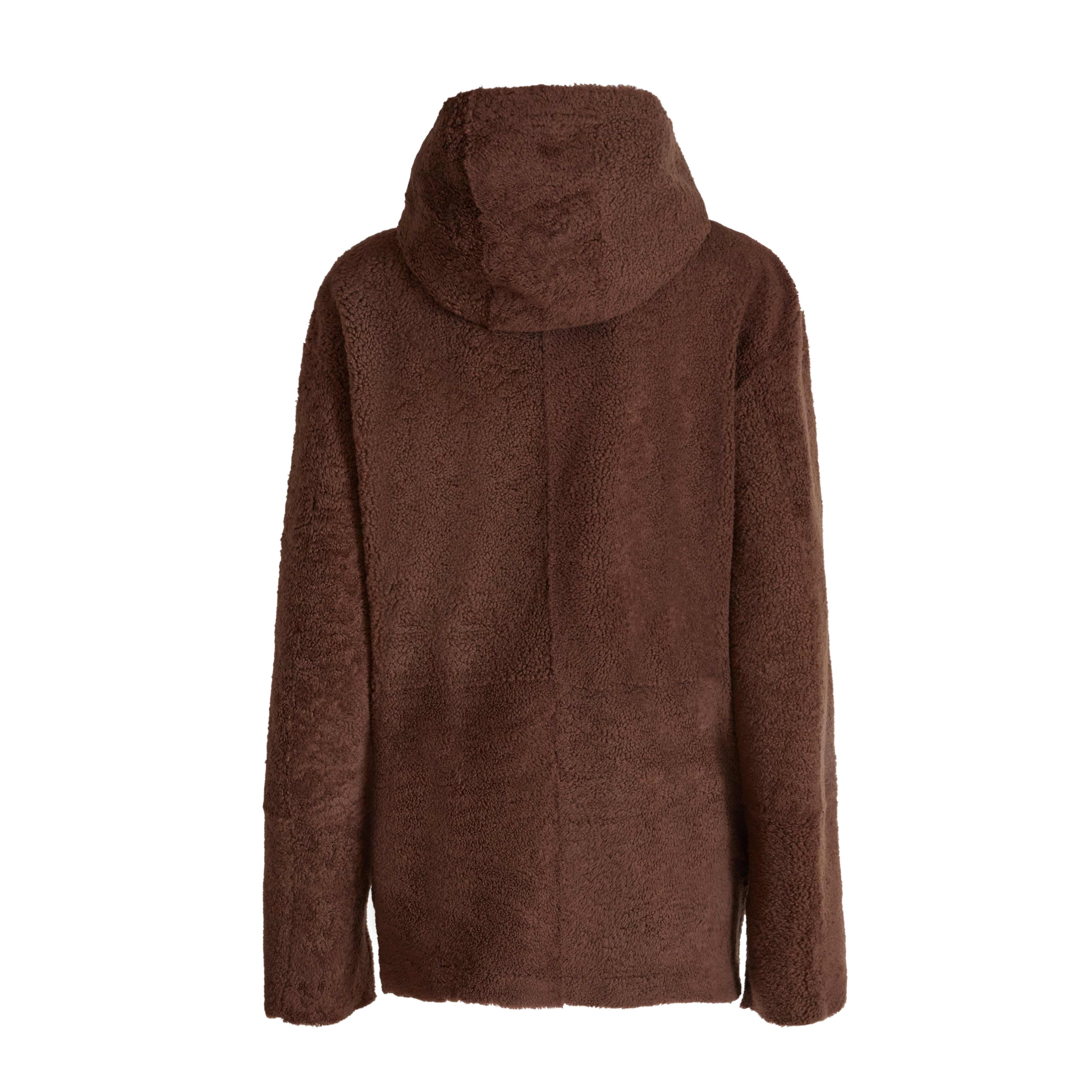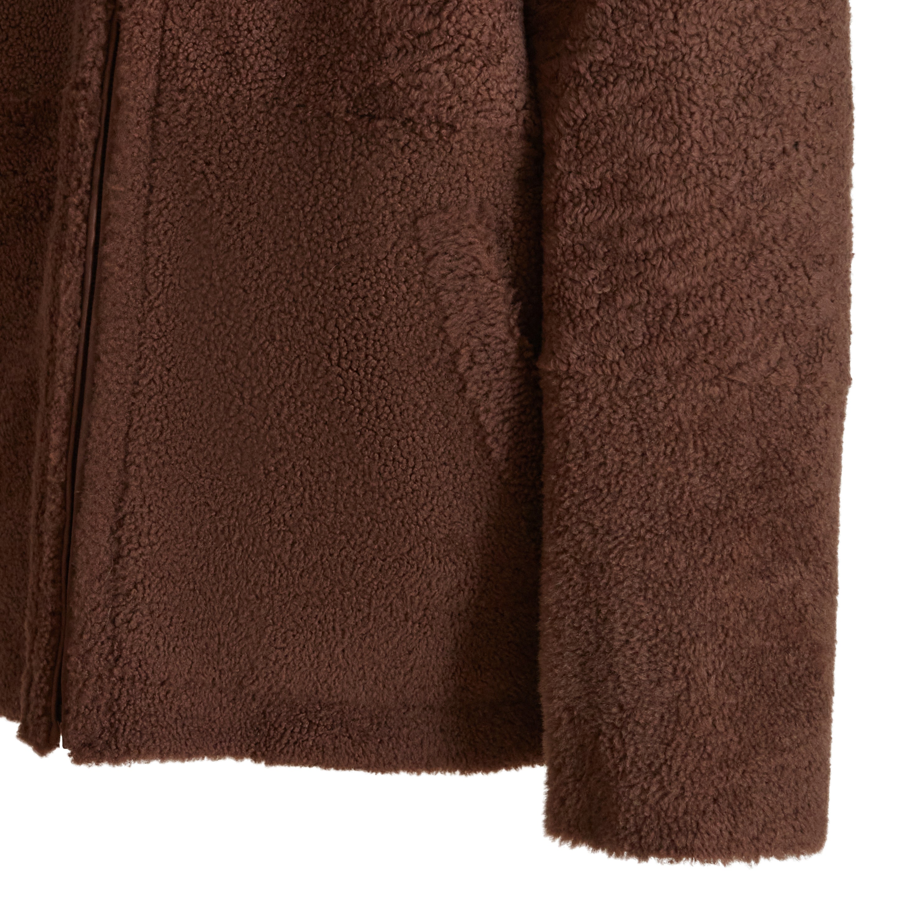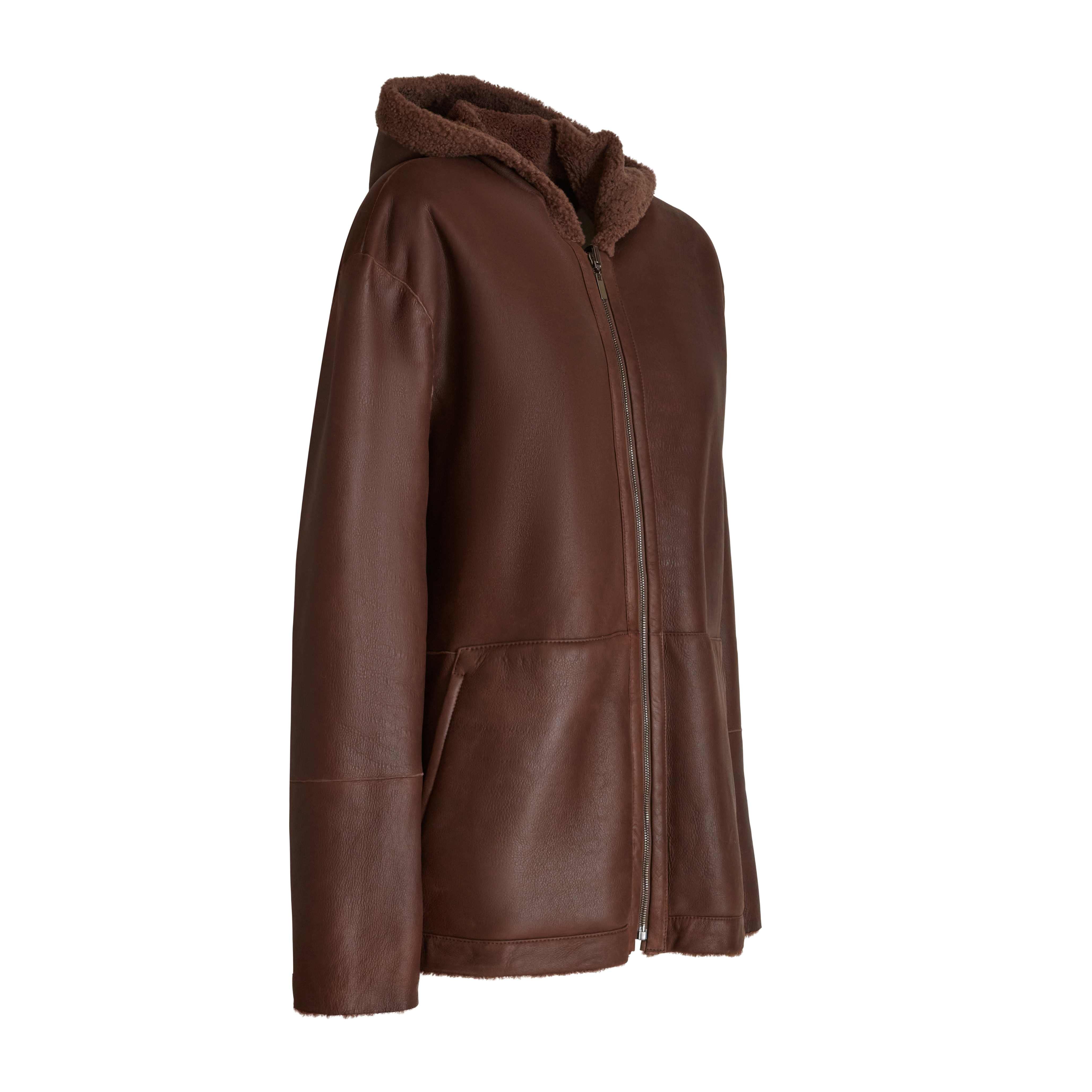 Giacca realizzata in morbido shearling reversibile a pelo riccio color marrone castagna. Questo modello si caratterizza per la scelta di un pellame particolarmente morbido e leggero, che offre comfort e calore contro il freddo, unito alla raffinatezza delle lavorazioni. Il design essenziale del capo è completato da tasche a taglio e da un ampio cappuccio.