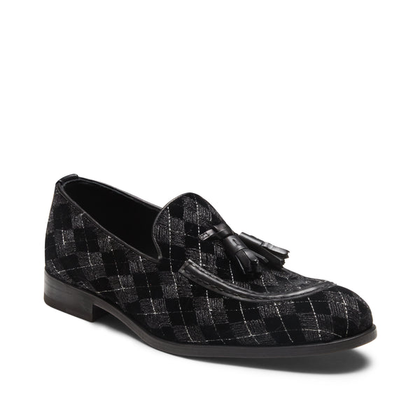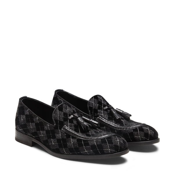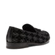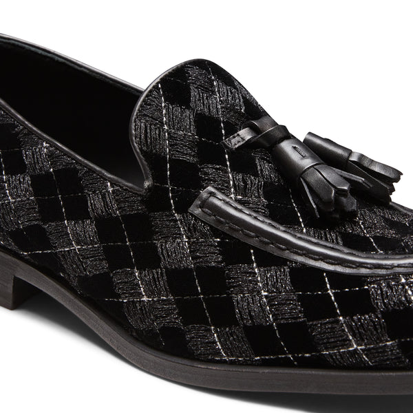 L'iconico mocassino Brera si veste di eleganza per la sera con un raffinato tessuto nero caratterizzato da ricami geometrici e inserti in fili di lurex argentato, che aggiungono un delicato tocco di luce. I profili e le nappine, in pelle in tono, completano il design, donando alla calzatura un aspetto sofisticato e contemporaneo. Suola in cuoio nera in tono alla fodera.