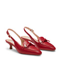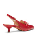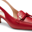Sandalo slingback in morbida pelle color rosso ribes. Il tacco di 35 mm e la punta sfilata slanciano la silhouette con discrezione, mentre il design � arricchito da un giro mocassino decorato con nappine, unite da un accessorio logato a passante. Un equilibrio perfetto tra eleganza sofisticata e modernit�.