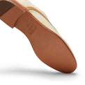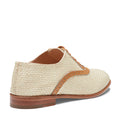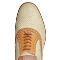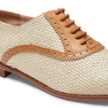 Francesina Primavera Estate 2026 dal design raffinato realizzata in morbido tessuto color paglia con effetto intreccio e profili in pelle liscia color nocciola. E' caratterizzata dall'allacciatura elastica e dalla lavorazione 'a sacchetto', un metodo artigianale che consiste nel cucire la fodera attorno alla forma come un guanto, garantendo comfort ed estetica raffinata. Suola in cuoio.
