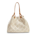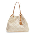 Tote bag della linea Royal interpretata in una versione estiva e sofisticata. Il tessuto in lino color avorio, lavorato con effetto pizzo macramé, richiama uno stile romantico e femminile, valorizzato da un reticolato di strisce in pelle color paglia che ne definiscono il design. Morbida e capiente, è suddivisa in due scomparti da una tasca centrale con zip. Impreziosita dal pendente rimovibile in pelle logato R dorato e tridimensionale, simbolo della maison.
