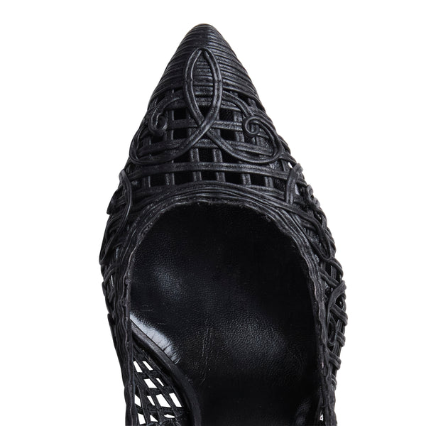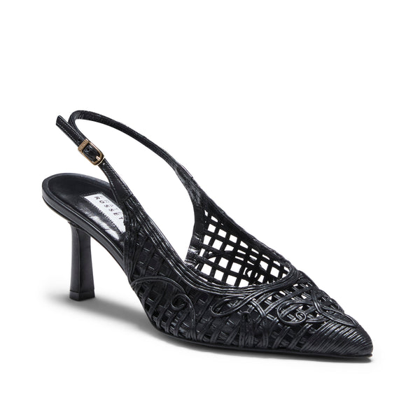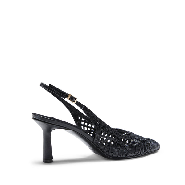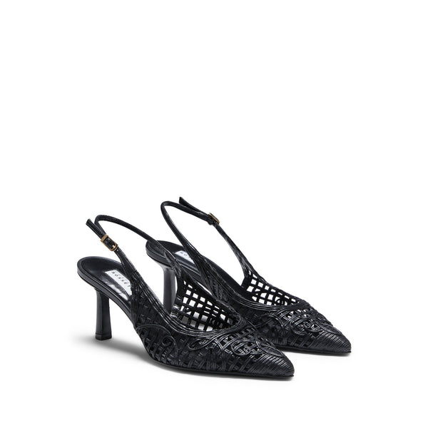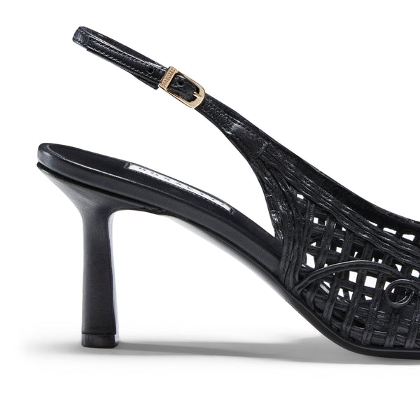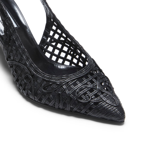 Raffinato ed esclusivo sandalo slingback realizzato in morbida pelle nera. La lavorazione artigianale prevede sottili listini di pelle sapientemente cuciti lungo la tomaia che disegnano il fiore Hobo sulla punta.