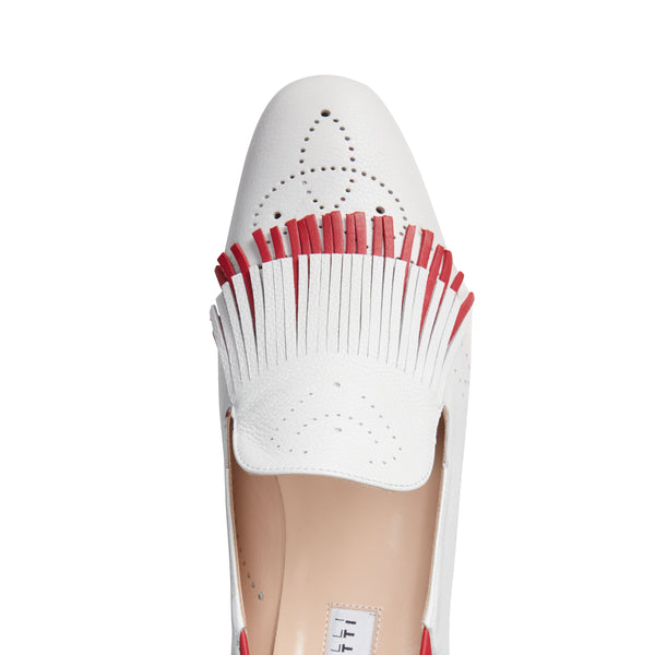 Iconica slipper Hobo realizzata in morbida pelle bottalata in un raffinato accostamento dei colori avorio e ribes. La tomaia è impreziosita da doppie frange e tallone ripiegabile in colore a contrasto. Suola in cuoio.