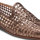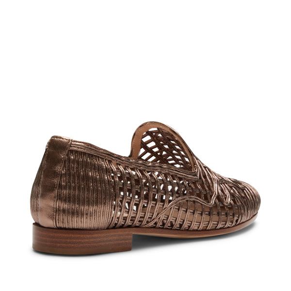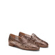 Raffinata ed esclusiva slipper realizzata in morbida pelle laminata color bronzo. La lavorazione artigianale prevede sottili listini di pelle sapientemente cuciti insieme lungo la tomaia che disegnano il fiore Hobo sulla punta.