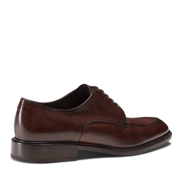 Raffinata Derby a forma sfilata caratterizzata dall'esclusiva cucitura rivoltata. Il pellame viene colorato a mano, donando alla calzatura un effetto sfumato artigianale. Suola in cuoio.