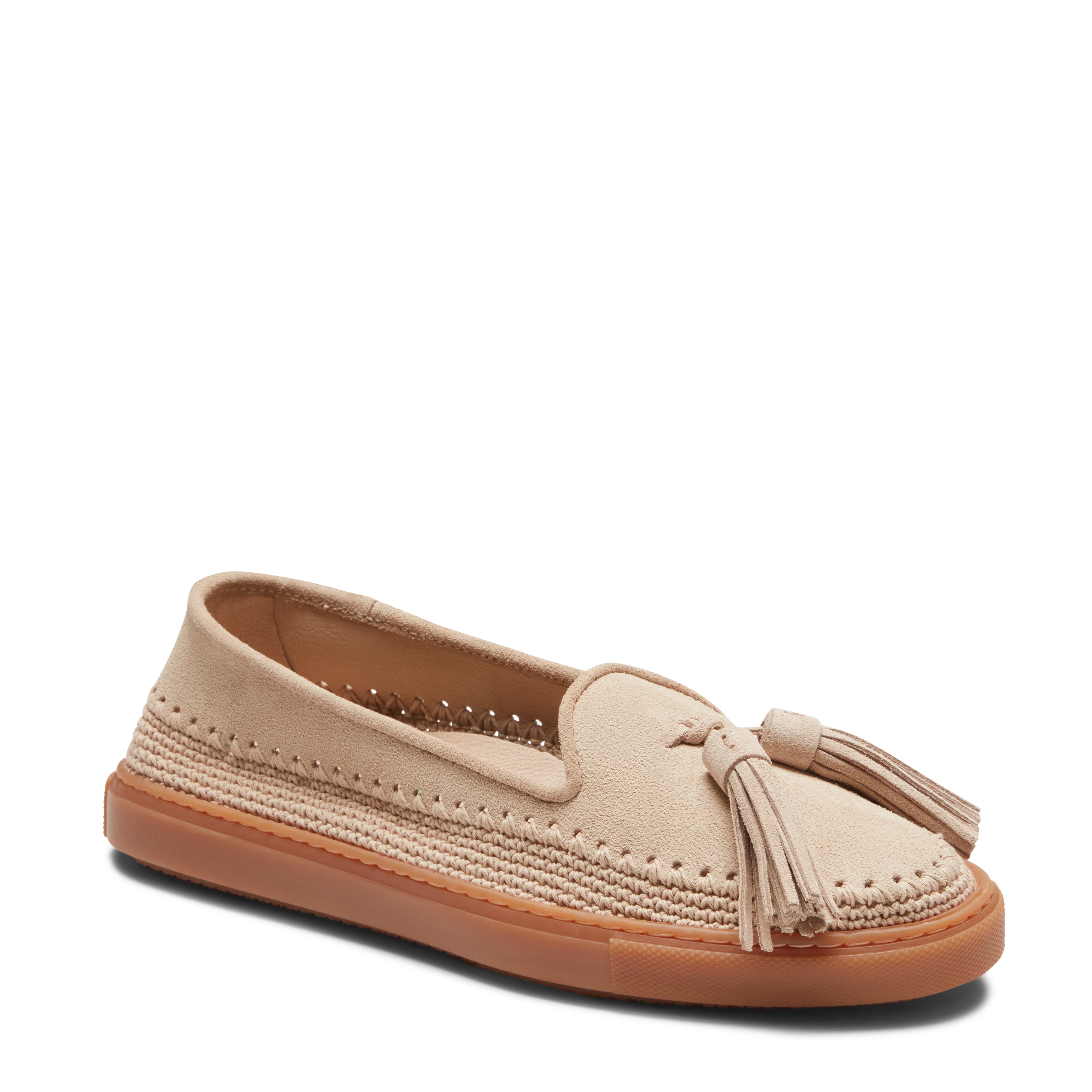 Liconico mocassino Brera è proposto in una versione sportiva ed eco-sostenibile, realizzato in morbida pelle scamosciata color canapa, con cuciture in cotone e nappine oversize che ne accentuano il carattere contemporaneo.