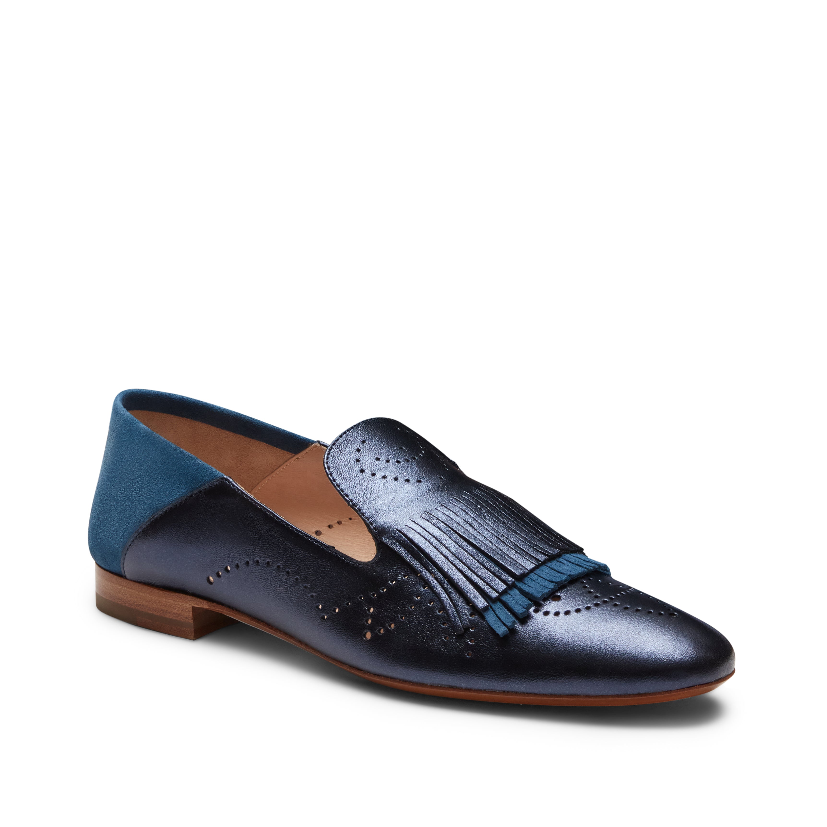 Iconica slipper Hobo realizzata in morbida pelle con effetto metallizzato in un raffinato accostamento dei colori blu e suede cobalto. La tomaia è impreziosita da doppie frange e tallone ripiegabile in colore a contrasto. Suola in cuoio.