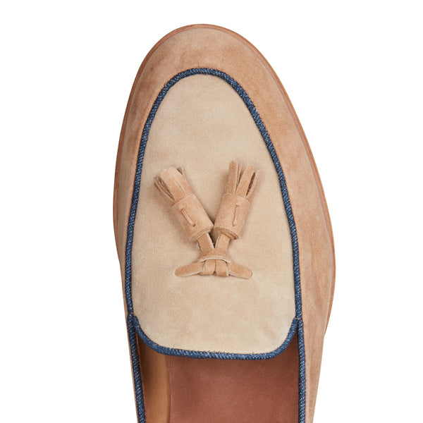 Mocassino Brera in versione estiva ed informale, realizzato in morbida pelle scamosciata bicolore nei toni del beige e latte. La particolarità di questa calzatura è la bordatura realizzata in denim che la rende sofisticata e allo stesso tempo casual. Suola in cuoio in tinta alla tomaia.