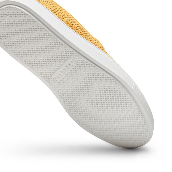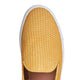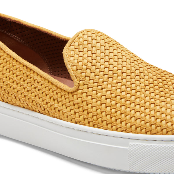Slipper con fondo a cassetta realizzata in morbida pelle scamosciata gialla finemente intrecciata che crea un raffinato effetto cromatico. Calzatura casual e dinamica che unisce comfort e stile.