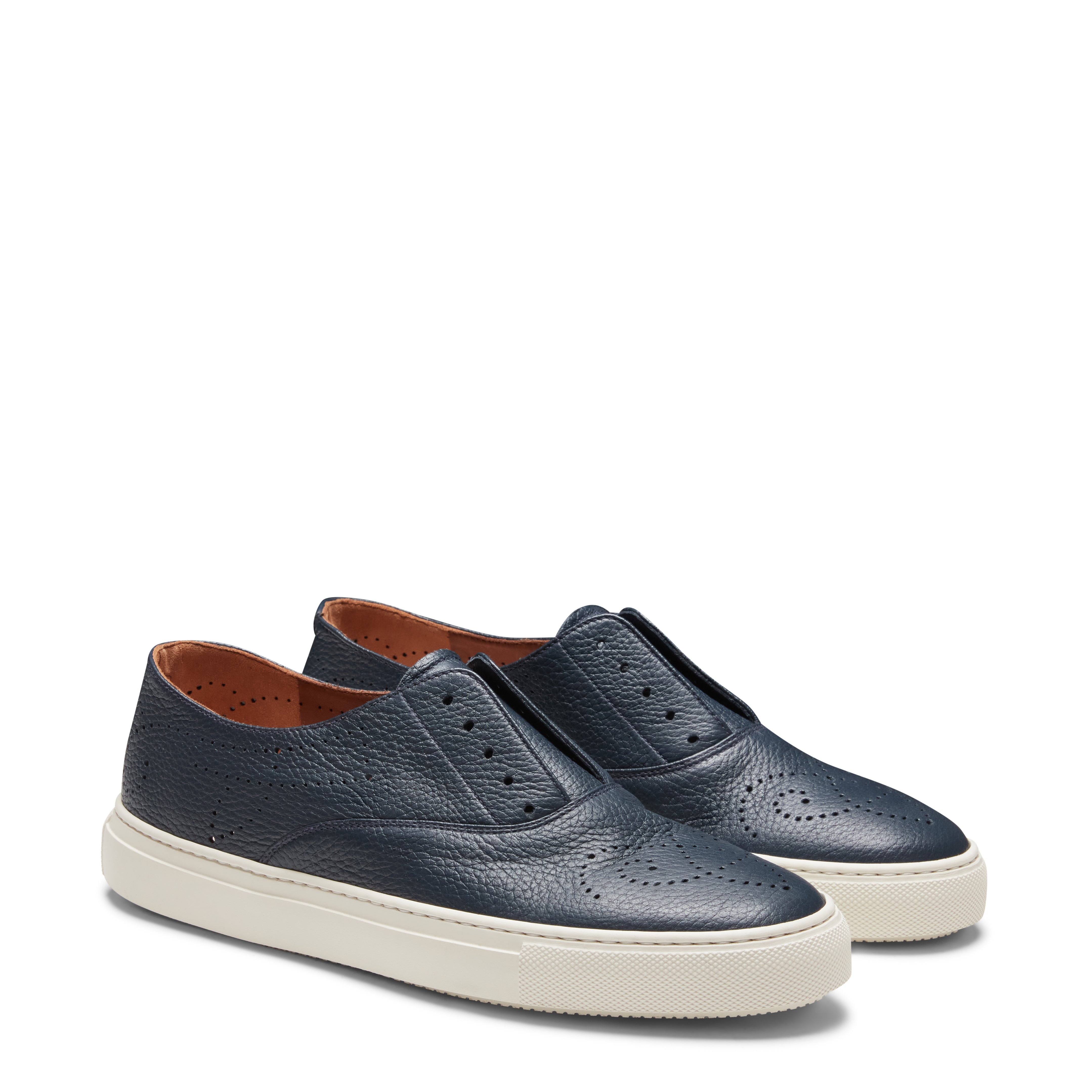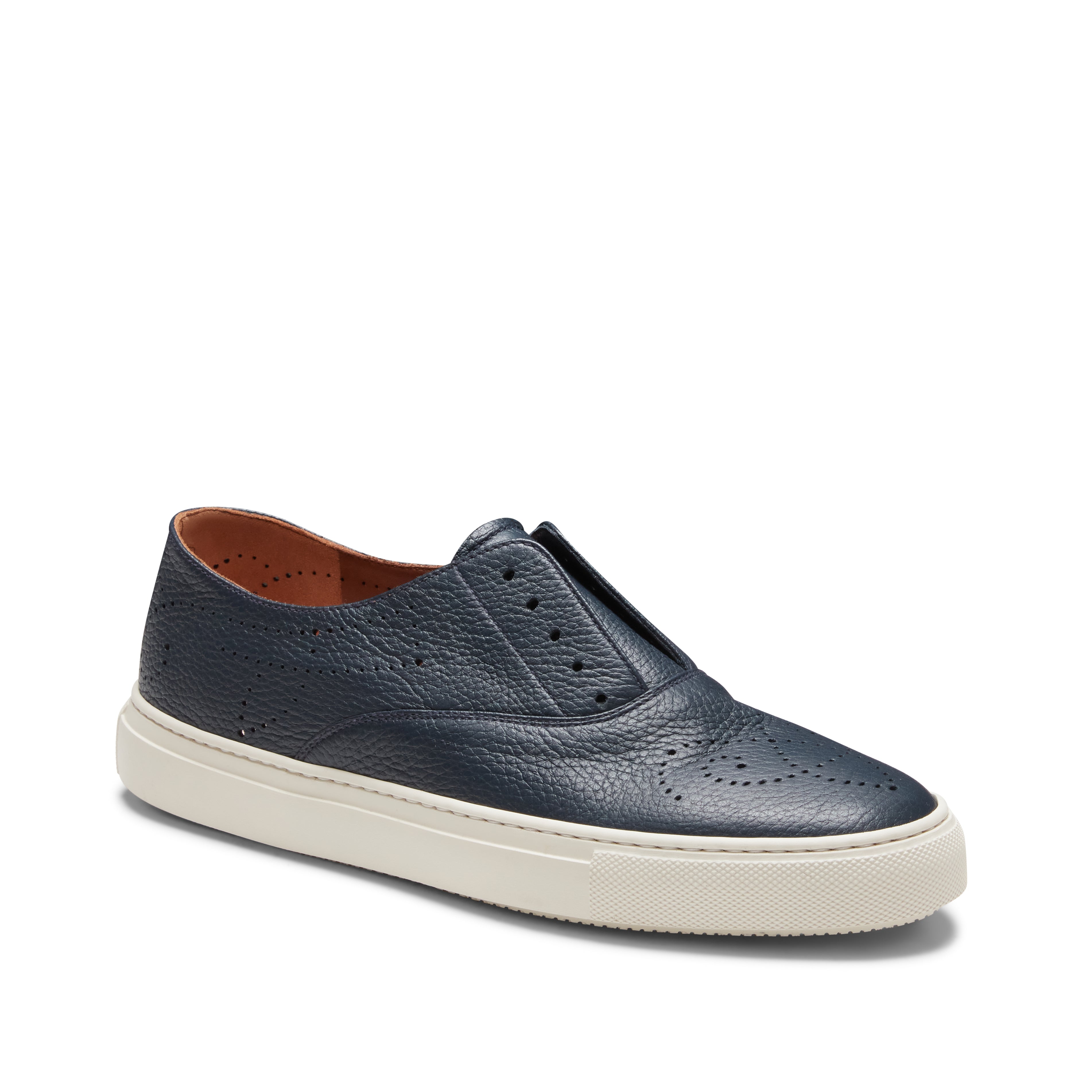 Sneaker Hobo Sport con fondo a cassetta e dettagli di forature, realizzata in morbida pelle in morbida pelle color blu navy con grana visibile. Calzatura casual e raffinata che può essere indossata senza lacci grazie a pratici elastici interni. Suola in gomma con battistrada personalizzato.
