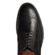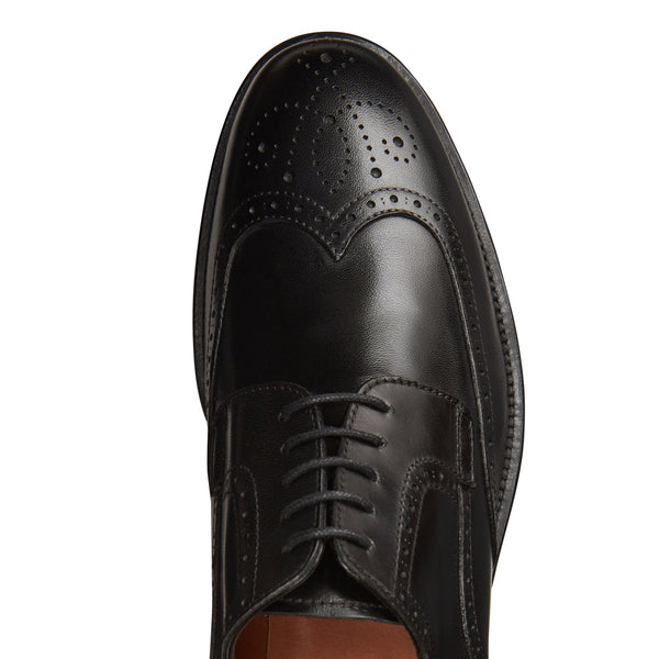 Stringata Derby brogue a cinque fori ispirata alle forme tradizionali anglosassoni, realizzata in morbida pelle liscia di colore nero spazzolata artigianalmente. Questo processo artigianale dona alla calzatura un aspetto semilucido e leggermente anticato. Calzatura dalla linea classica, per un look impeccabile unito ad una calzata confortevole. Suola in cuoio con mezza pianta in gomma.