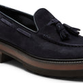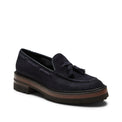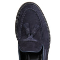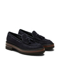 L'iconico Brera è il mocassino con nappine di Fratelli Rossetti, realizzato in pelle scamosciata blu navy con particolare stampa millerighe. Queste calzature sono la raffinata interpretazione di un moderno look androgino. Suola carrarmato in gomma con inserto in cuoio.