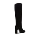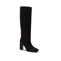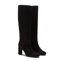 Linee essenziali disegnano lo stivale con gambale a tubo realizzato in morbida pelle scamosciata nera. Modello che si caratterizza per la forma quadrata e l'ampio tacco 80mm, must-have per un look raffinato. Suola in cuoio con inserto in gomma. br>Art. 68167