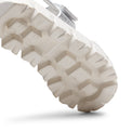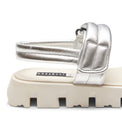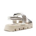 Sandalo flat con cinturino e ampie fasce realizzato in morbida pelle trapuntata color argento. Comodo grazie alla soletta sagomata. La particolare suola scanalata lo rende perfetto per un look casual e ricercato.