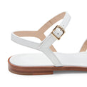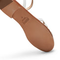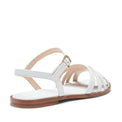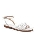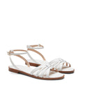 Sandalo flat dallo stile elegante e artigianale realizzato in morbida pelle liscia bianca. Coniuga comfort e raffinatezza. Le fasce intrecciate avvolgono il piede creando motivi geometrici che richiamano l'arte della tessitura. Gli intrecci larghi esaltano un'estetica sofisticata e naturale, perfetta per l'estate.