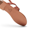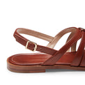 Sandalo infradito flat dallo stile elegante e artigianale realizzato in morbida pelle liscia color mandorla. Coniuga comfort e raffinatezza. Le fasce intrecciate avvolgono il piede creando motivi geometrici che richiamano l'arte della tessitura. Gli intrecci larghi esaltano un'estetica sofisticata e naturale, perfetta per l'estate.