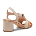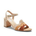 Sandalo sofisticato ed artigianale, realizzato in morbida pelle scamosciata in una raffinata combinazione di tonalit� marroni calde e sabbiose. Il design presenta linee ondulate e avvolgenti, ispirate al movimento delle onde, arricchite da punti cuciti a mano che valorizzano la cura dei dettagli. Suola in cuoio e ampio tacco 60 mm.