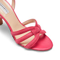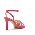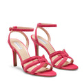 Sandalo raffinato e femminile, realizzato in pelle scamosciata e liscia color fucsia. Le sottili fasce avvolgono il piede, valorizzando la silhouette. Il tacco altezza 90 mm, ricoperto in pelle, slancia la figura. La tomaia � realizzata con la tecnica innovativa dell'alta frequenza, che consente di unire materiali diversi attraverso giunzioni invisibili e resistenti, senza l'utilizzo di cuciture.