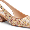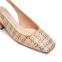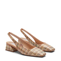 Raffinato sandalo slingback dalla forma leggermente quadrata realizzata in in tessuto dall'effetto rafia intrecciata multicolore. Must have di stagione che unisce un'estetica minimal ad una fantasia dal carattere estivo. Suola in cuoio e comodo tacco svasato ricoperto 40mm.
