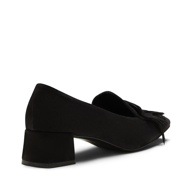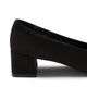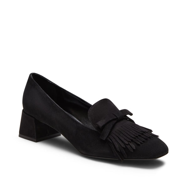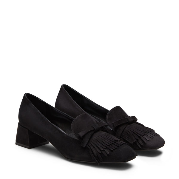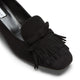 Slipper a forma squadrata declinata in tacco 40mm. Realizzata in pelle scamosciata nera, si caratterizza per linee femminili e raffinati dettagli come la mascherina decorata con frangia e fiocchetto. Calzatura chic e bon ton, dona eleganza a qualsiasi outfit. Suola in cuoio nera in tono alla fodera.