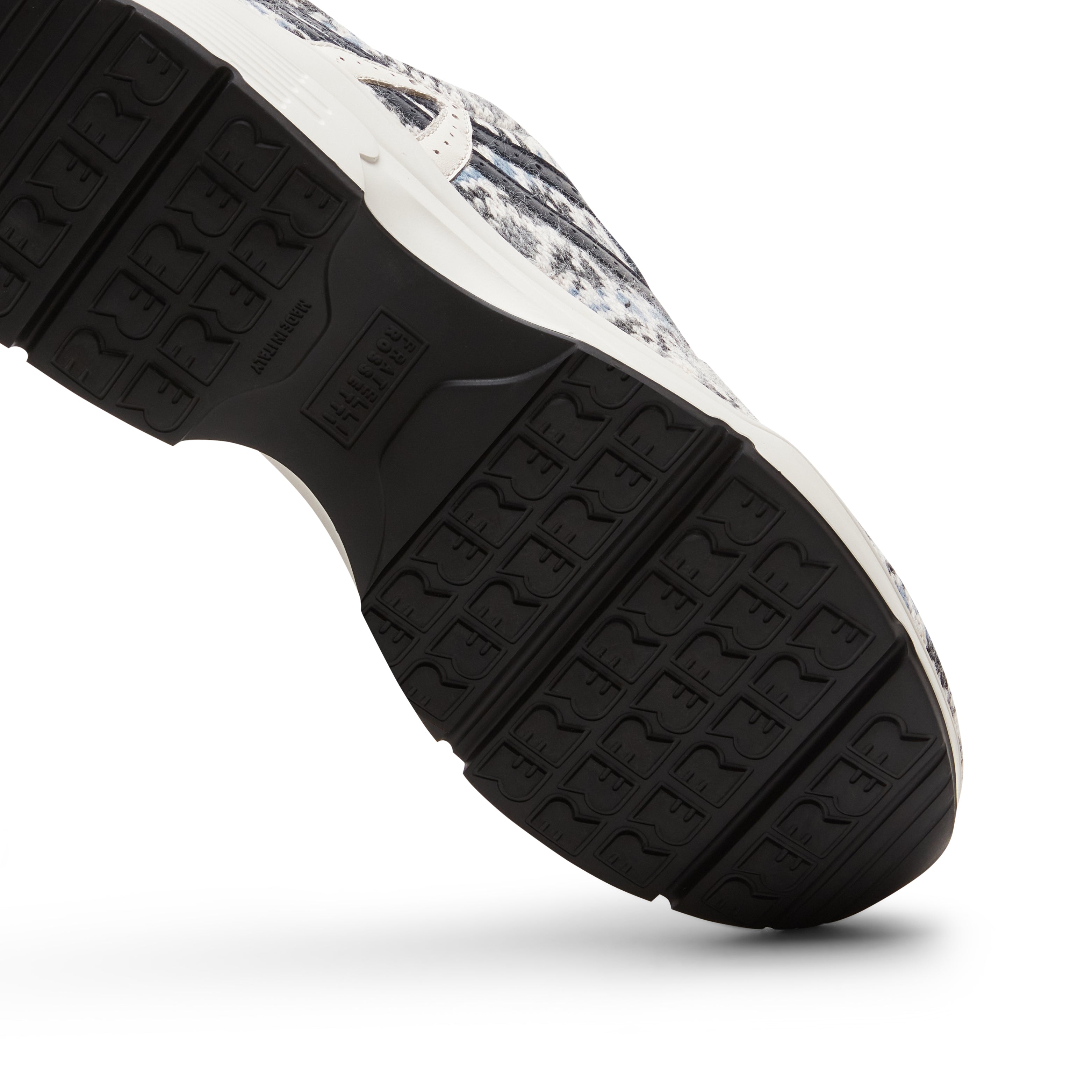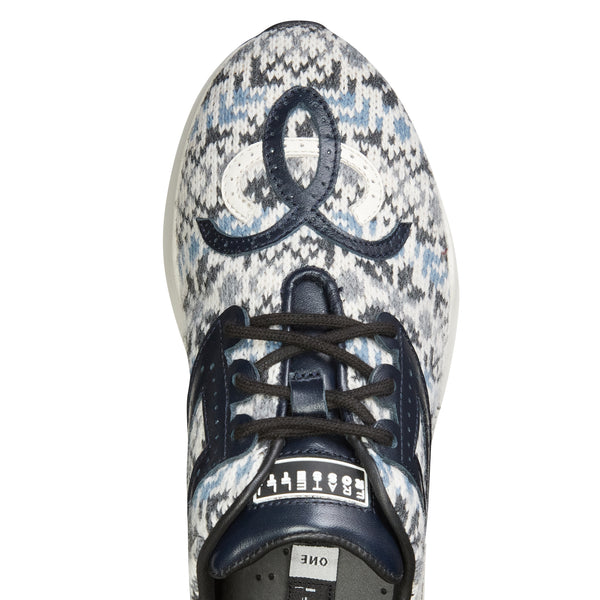 Sneaker dal look ricercato realizzata in tessuto con pattern a fantasia tipicamente invernale che ricorda i caldi maglioni lavorati a mano nei toni del grigio e del blu. Gli inserti in pelle rivelano dettagli artigianali come le bucature e il fiore Hobo sulla punta. Calzatura che ridefinisce il concetto di sportswear per chi cerca la comodità di un outfit sportivo senza rinunciare ad un tocco glamour. Suola in gomma extra light bicolore.