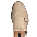 Raffinato derby doppia fibbia dalla forma semi tonda, realizzata in morbida pelle scamosciata color latte. Questa calzatura richiama uno stile urban e si caratterizza per la suola in cuoio con effetto lavato.