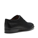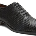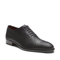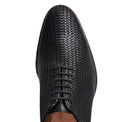 Raffinata francesina Richelieu realizzata in morbida pelle di colore nero. La tomaia è finemente intrecciata ed è caratterizzata da un'esclusiva lavorazione artigianale che dona al pellame un leggero effetto anticato e una maggiore lucentezza.