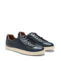 Sneaker dal look vintage interpretata in chiave contemporanea, realizzata in morbida pelle color blu navy con grana visibile. Calzatura che coniuga artigianalità e stile. La suola in gomma naturale super flessibile dona all'intera calzatura leggerezza e comfort senza eguali.