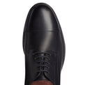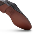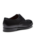 Raffinata stringata Derby a cinque fori con puntale, realizzata in morbida pelle liscia di colore nero spazzolata artigianalmente. Questo processo artigianale dona alla calzatura un aspetto semilucido per un look impeccabile unito ad una calzata confortevole. Suola in cuoio.