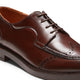 Edler Derby in leicht abgerundeter maskuliner Ausführung mit Loafer-Nähten. Gefertigt aus von Hand gefärbtem mahagonibraunem Leder in zweifarbiger Optik, welche die handgefertigten Details unterstreicht. Die Brogue-Verzierung auf der Kappe ist schön verspielt und feminin. Ledersohle mit Gummieinlage.