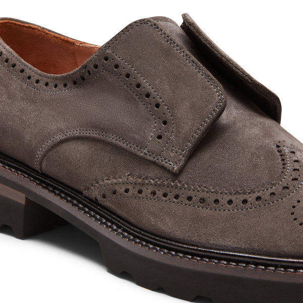 Dandy, der schnürsenkellose Derby für die Wintersaison, hebt die traditionellen handwerklichen Details des Brogue-Schuhs mit Perforationen und einer Blume an der Spitze hervor. Perfekter maskuliner Look in stahlfarbenem, wasserabweisendem Wildleder. Gummisohle mit Lederzwischensohle.