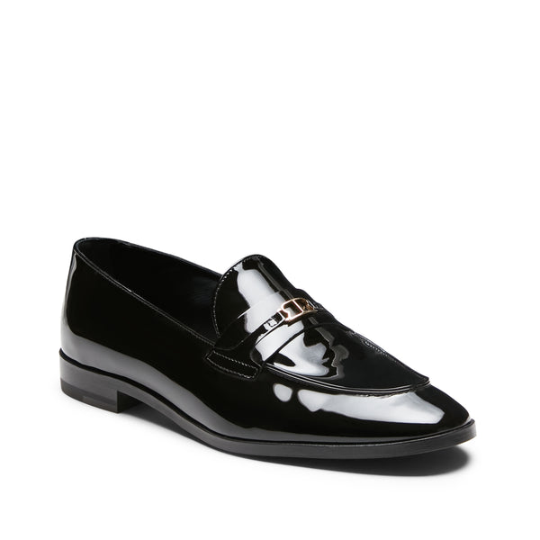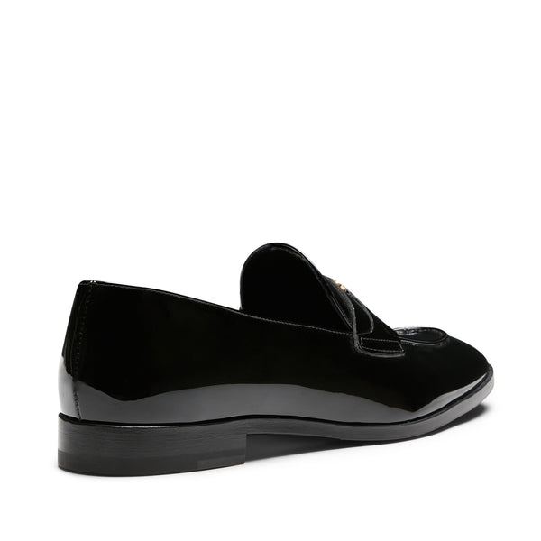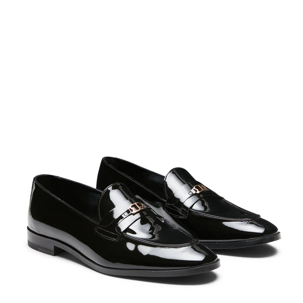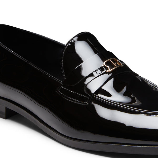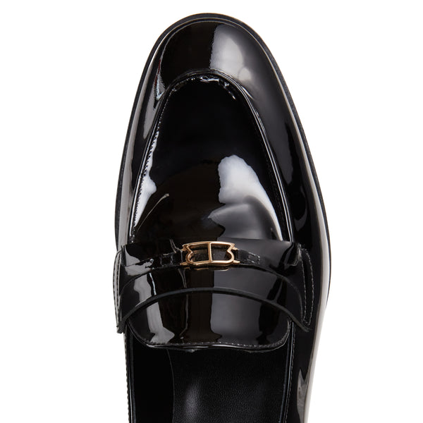 Edler Loafer aus schwarzem Lackleder, der feminine Details mit einem maskulinen Design vereint. Das Modell zeichnet sich aus durch eine mit zwei kleinen goldenen Details verzierte Maske, die für die Marke charakteristisch ist. Auf das Futter farblich abgestimmte, schwarze Ledersohle.