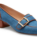 Feminin-eleganter, quadratischer Loafer mit Riemchen und Schnalle, aus Denim in Chinesisch Blau. Bequemer 40-mm-Absatz, der mit dem gleichen Leder wie das Obermaterial bezogen ist. Ledersohle mit Gummieinsatz. br>Art. 68222