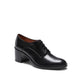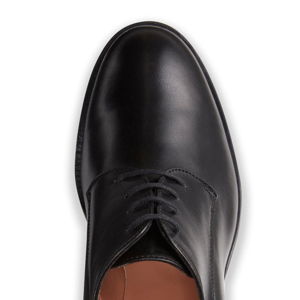 Allure intramontabile per questa derby a quattro fori caratterizzata dalla punta tonda. Realizzata in morbida pelle nera con effetto anticato. Lo stile androgino e contemporaneo della calzatura è completato dal comodo tacco 50mm. Suola in cuoio con mezza pianta in gomma.