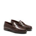 Schlauchförmiger Loafer mit Riemen aus weichem ebenholzfarbenen Glattleder mit leichter Antikoptik. Ein äußerst vielseitiger und raffinierter Schuh. Passende Gummisohle in Schwarz mit besonderer Textur, die den Komfort unterstreicht.