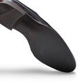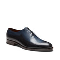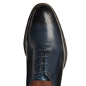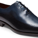 Ein besonderer und exklusiver Richelieu. Das Leder wird mittels Tamponierung per Hand gefärbt. Dabei stellen unsere erfahrenen Meister eine besondere, zweifarbige Schattierung aus Dunkelblau und Schwarz her, der bei jedem Paar ein klein wenig anders ausfällt. Herausstechendes Merkmal des Schuhs sind die Perforationen unterschiedlicher Größe, die auf der Schuhspitze eine Blume bilden und das Obermaterial zieren. Zweifarbige Ledersohle.