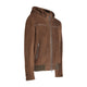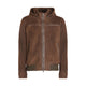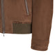 Edle Bomberjacke aus moosgrünem Shearling mit Velourslederfinish. Das Kleidungsstück ist mit Lederprofilen versehen, die die lineare Ästhetik des Kleidungsstücks aufbrechen und für Bewegung sorgen. Die Kapuze ist abnehmbar und der Saum und die Bündchen bestehen aus farblich abgestimmten Wollrippstrick.