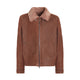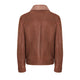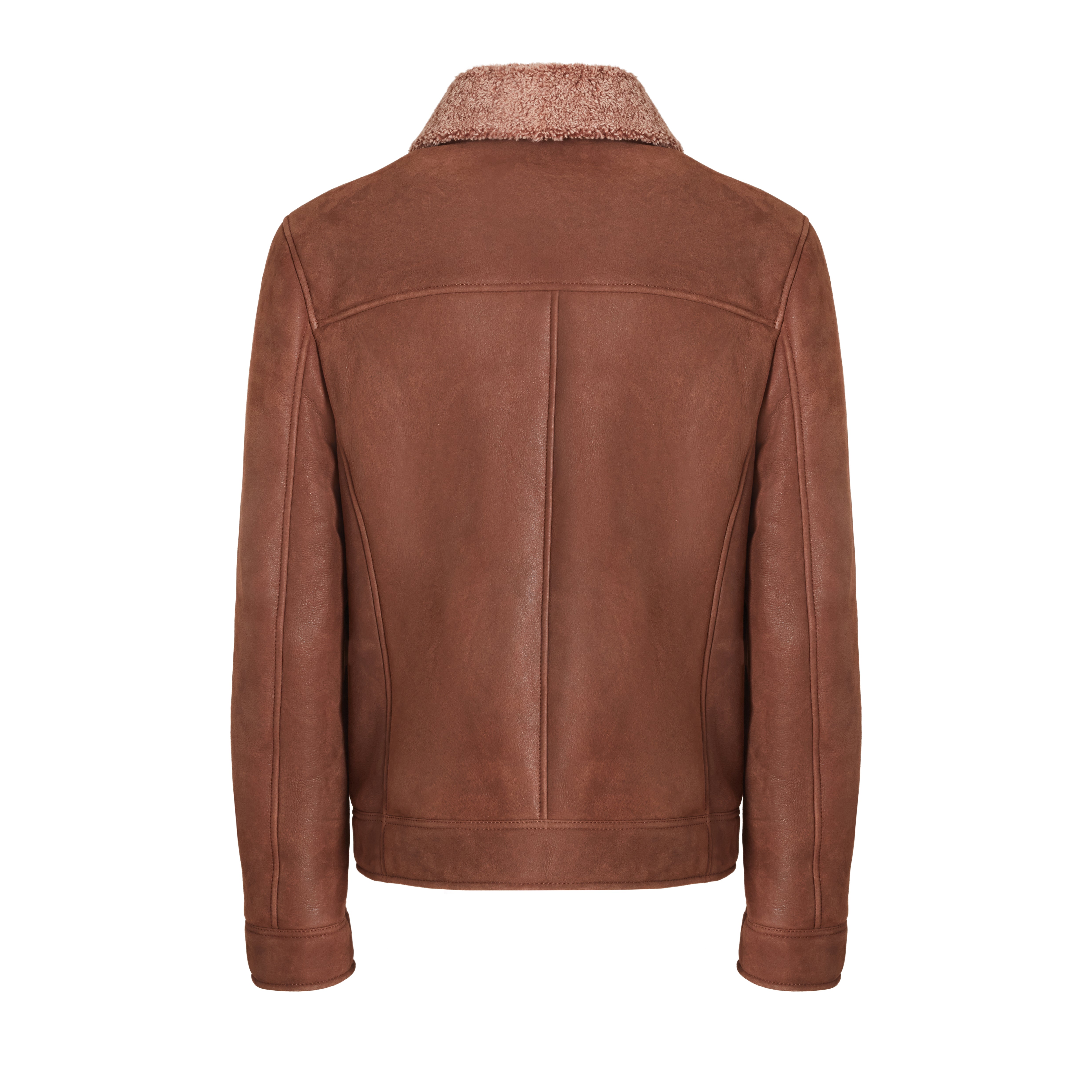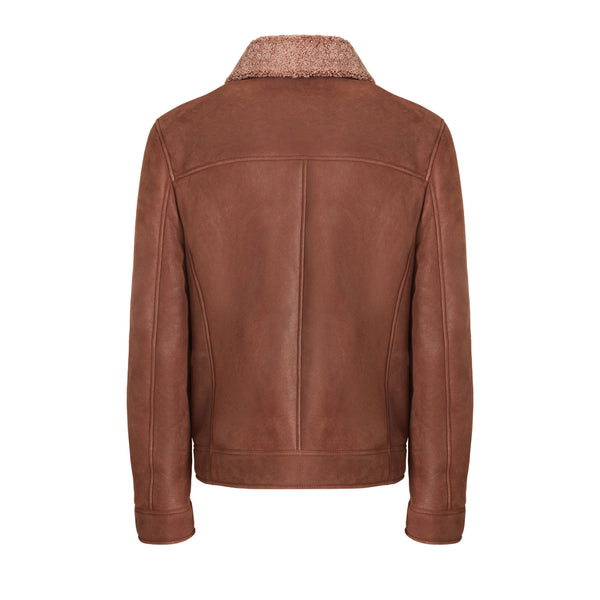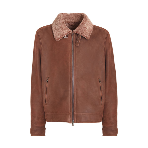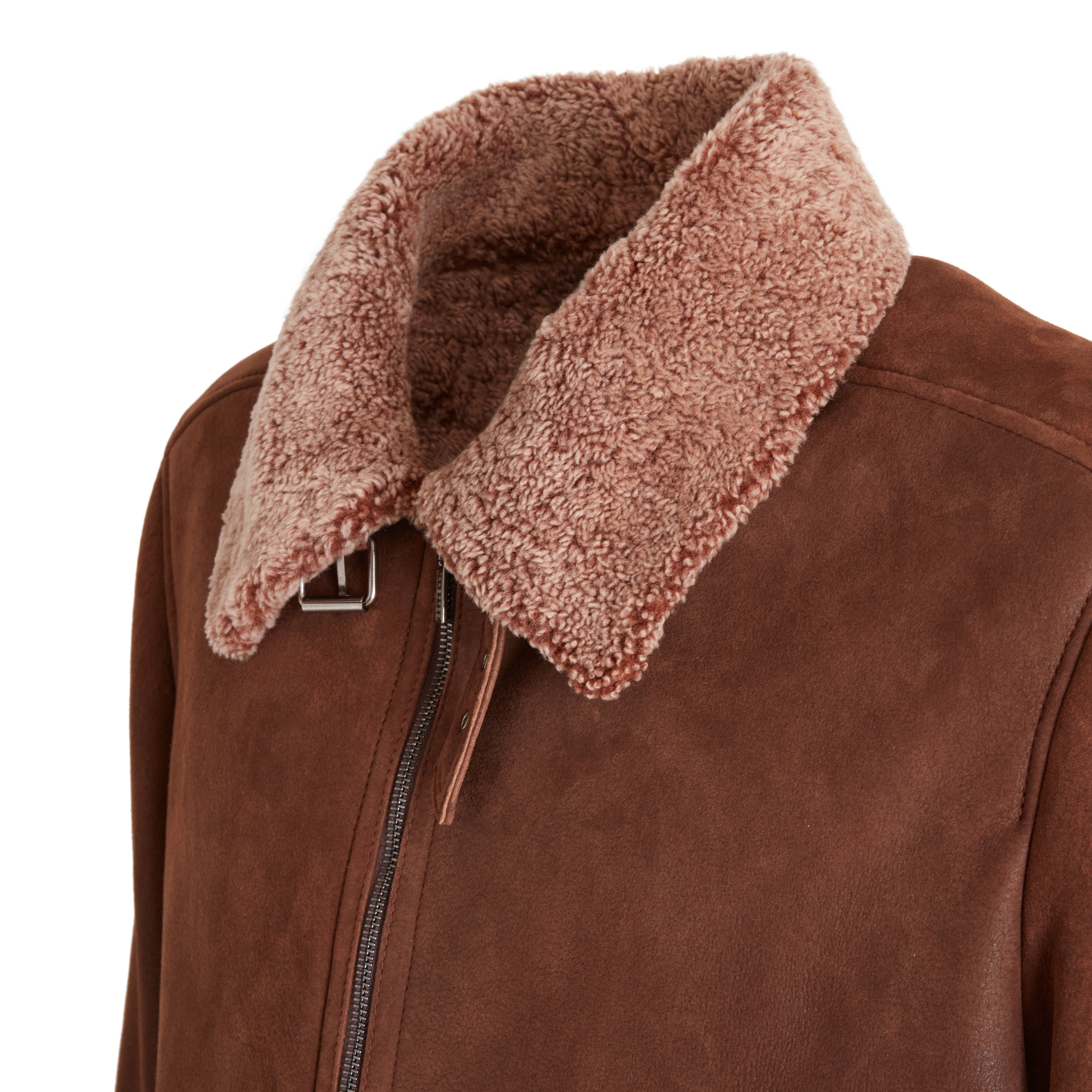 Jacke aus weichem tabakbraunen Nappa-Shearling mit Lockenfell. Das lässige Modell zeichnet sich durch ein leichtes Krakelee-Finish aus, das dem Leder Bewegung verleiht. Der Kragen verfügt über einen Riemen mit verstellbarer Schnalle, der an den Stil der Fliegerjacke erinnert und hier in einer edlen Variante neu interpretiert wird.