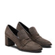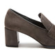 Dieser Loafer aus weichem anthrazitgrauen Veloursleder zeichnet sich durch einen weiblichen Charakter und eine zeitlose Eleganz aus. Die von Hand gesetzten Nähte, die den Riemen zieren, unterstreichen die handwerkliche Verarbeitung. Bequemer bezogener Absatz mit einer Höhe von 6 cm. Ledersohle mit Gummieinlage.
