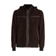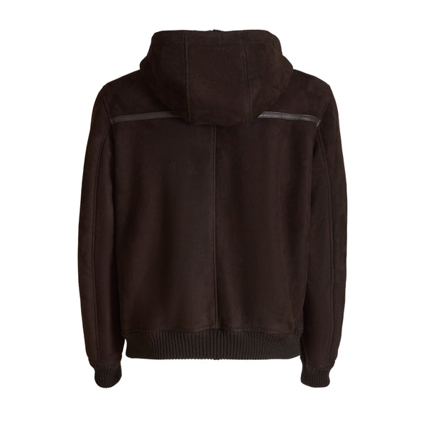 Raffinato bomber in shearling verde muschio con finitura scamosciata. Questo capo si caratterizza per i profili in pelle che spezzano l'estetica lineare del capo, creando movimento. Il cappuccio è rimovibile e il fondo e i polsi sono in maglia di lana a coste in tono.