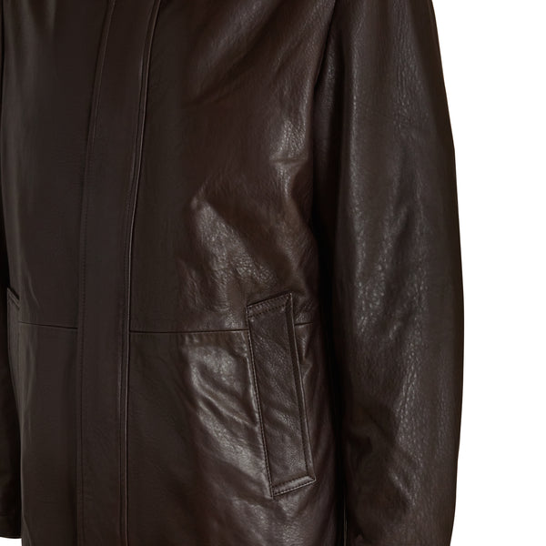 Caban dal look ricercato, realizzato in morbida nappa bottalata color marrone. Il capo presenta tasche laterali, cappuccio rimovibile, collo stile camicia rivestito in morbido shearling staccabile e chiusura centrale con zip nascosta. Modello versatile ed essenziale.